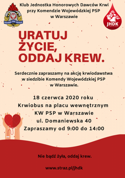 Akcja krwiodawstwa będzie miała miejsce w krwiobusie w godzinach 9:00-14:00, który będzie na Was czekał na placu wewnętrznym KW PSP w Warszawie przy ul. Domaniewskiej 40.
